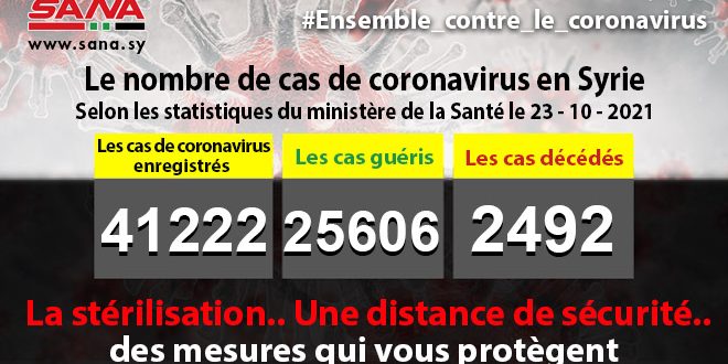 Dans un communiqué, dont une copie est parvenue à SANA, le ministère a fait noter que le bilan des cas de coronavirus enregistrés jusqu’à présent en Syrie avait atteint 41222, dont 25606 cas de guérison et 2492 décès.