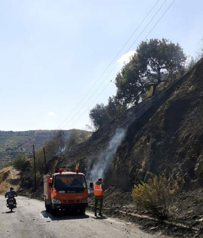 Homs-SANA/Des éléments de la Défense civile à Homs, en coopération avec les pompiers de la Direction de l’agriculture, ont éteint aujourd’hui un incendie qui s’était déclaré dans les oliviers et les herbes sèches dans les terrains agricoles du village de Fahel dans banlieue ouest du gouvernorat.