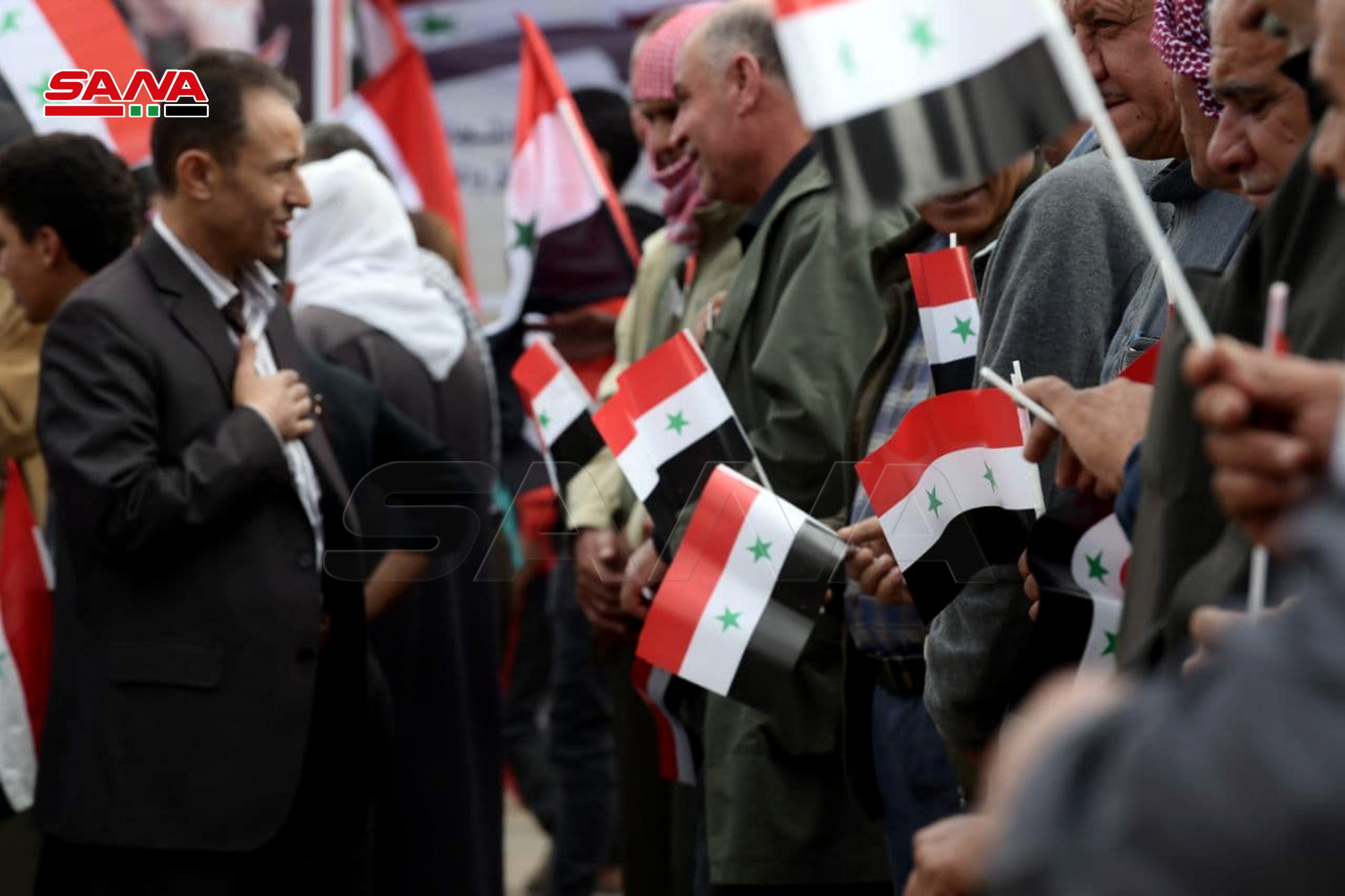 Les participants au sit-in ont hissé des drapeaux et des pancartes dénonçant l’ingérence du régime turc dans les affaires syriennes et les crimes commis par les forces d’occupation et les terroristes contre les habitants, appelant à mettre fin à la présence illégale turque sur les territoires syriens.