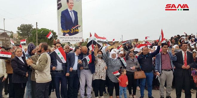 Les participants ont porté le drapeau national et les pancartes qui dénoncent les crimes commis par les forces de l’occupation et les terroristes contre les habitants, appelant à mettre fin à leur présence illégale sur les territoires syriens.