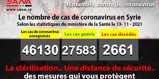 Dans un communiqué, dont une copie est parvenue à SANA, le ministère a fait noter que le bilan des cas de coronavirus enregistrés jusqu’à présent en Syrie avait atteint 46130, dont 27583 cas de guérison et 2661 décès.