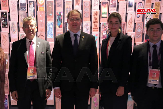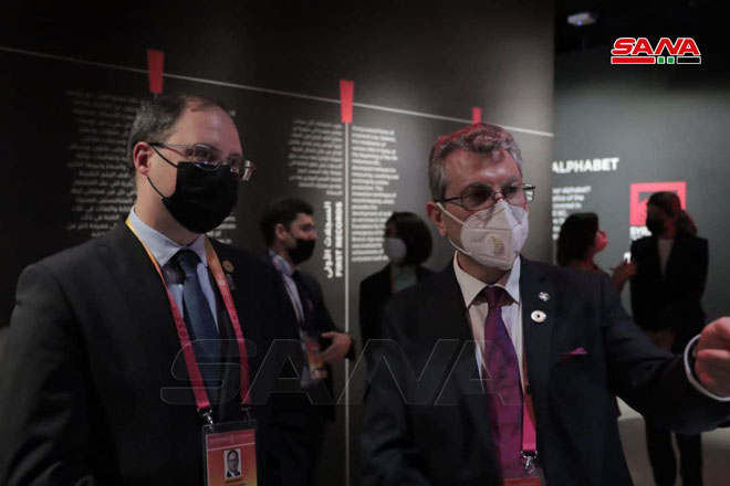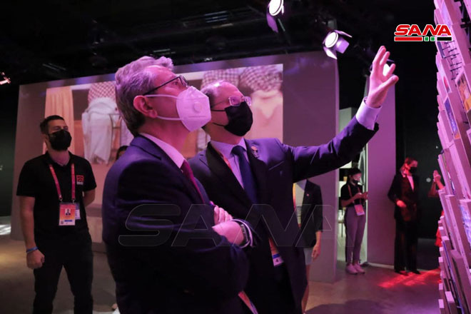 L’ambassadeur de Syrie aux Emirats Arabes Unis, commissaire général du pavillon syrien, Ghassan Abbas, et le directeur du pavillon, l’ingénieur Khaled al-Shamaa ont reçu la délégation russe alors que des employés et volontaires syriens ont donné aux invités un aperçu sur les sections du pavillon qui reflètent l’histoire et les anciennes civilisations qui se sont succédées sur le territoire syrien.