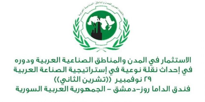Damas-SANA/Les activités de la 4e conférence de l’Union arabe des villes et des zones industrielles arabes commenceront le 29 du mois en cours à Damas sous le titre : « L’investissement dans les villes et les zones industrielles arabes et son rôle dans la réalisation d’un bond spécifique ».