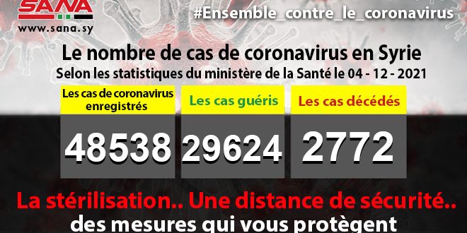 Dans un communiqué, dont une copie est parvenue à SANA, le ministère a fait noter que le bilan des cas de coronavirus enregistrés jusqu’à présent en Syrie avait atteint 48538, dont 29624 cas de guérison et 2772 décès.