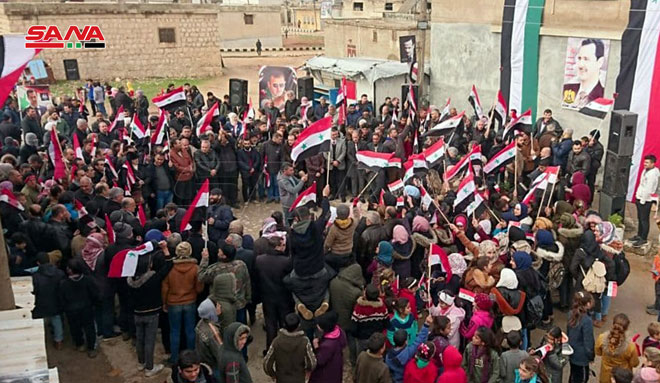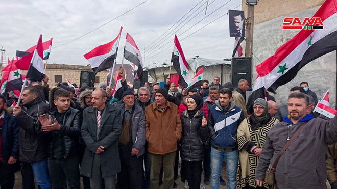 Banlieue d’Alep- SANA /Les habitants du village de Kafar Nasseh, dans la région d’Izaz, dans la banlieue nord d’Alep, ont observé aujourd’hui un sit-in de protestation en signe du rejet de l’occupation turque et de ses mercenaires des réseaux terroristes.