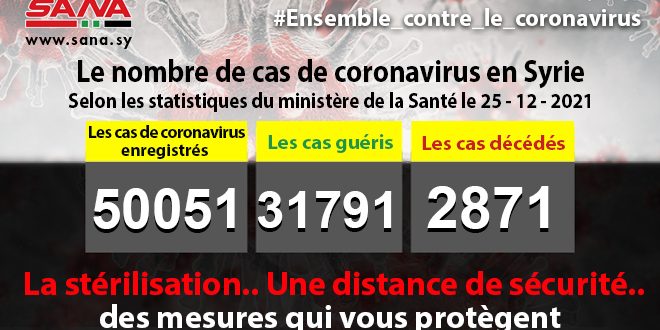 Dans un communiqué, dont une copie est parvenue à SANA, le ministère a fait noter que le bilan des cas de coronavirus enregistrés jusqu’à présent en Syrie avait atteint 50051, dont 31791 cas de guérison et 2871 décès.