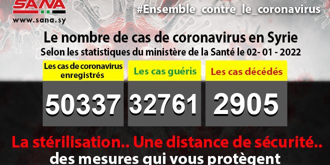 Dans un communiqué, dont une copie est parvenue à SANA, le ministère a fait noter que le bilan des cas de coronavirus enregistrés jusqu’à présent en Syrie avait atteint 50337, dont 32761 cas de guérison et 2905 décès.