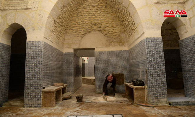 Alep-SANA / Le Hammam Al-Nahhaseen a repris son éclat ayyoubide comme icône antique qui a maintenu sa beauté au fil des années, a repris sa vivacité après que les opérations de réhabilitation et de restauration s’approchent de leur fin pour éliminer impacts du terrorisme.