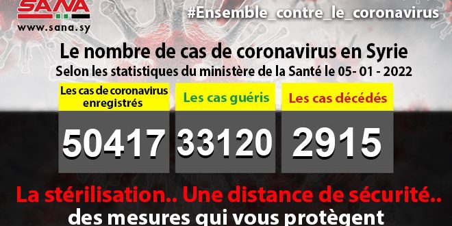 Dans un communiqué, dont une copie est parvenue à SANA, le ministère a fait noter que le bilan des cas de coronavirus enregistrés jusqu’à présent en Syrie avait atteint 50417, dont 33120 cas de guérison et 2915 décès.