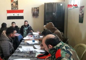 Deir Ezzor-SANA/ Le processus de régularisation de la situation des civils recherchés, des déserteurs militaires et des personnes qui ont échappé aux deux services obligatoire et de réserve parmi les habitants du gouvernorat de Deir Ezzor s’est poursuivi dans le centre de Chemeittiyah dans la banlieue ouest de Deir Ezzor.