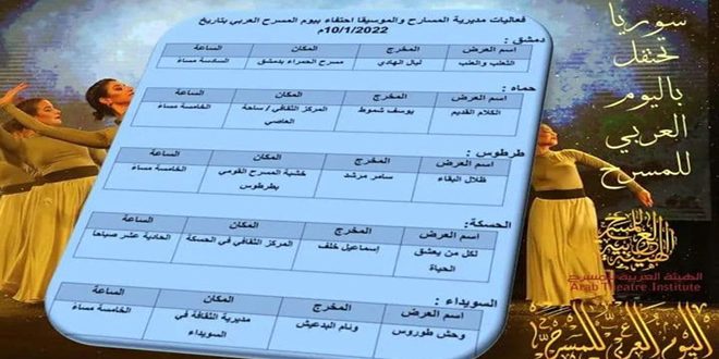 Damas -SANA/La Direction des théâtres et de la Musique du ministère de la Culture célèbre aujourd’hui la Journée du théâtre arabe par une cérémonie qui comprend cinq spectacles présentés par les équipes du Théâtre national dans cinq gouvernorats.