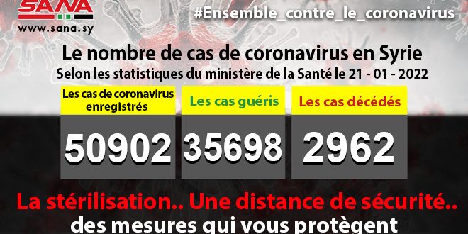 Dans un communiqué, dont une copie est parvenue à SANA, le ministère a fait noter que le bilan des cas de coronavirus enregistrés jusqu’à présent en Syrie avait atteint 50902, dont 35698 cas de guérison et 2962 décès.