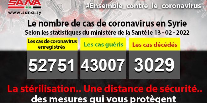 Dans un communiqué, dont une copie est parvenue à SANA, le ministère a fait noter que le bilan des cas de coronavirus enregistrés jusqu’à présent en Syrie avait atteint 52751, dont 43007 cas de guérison et 3029 décès.