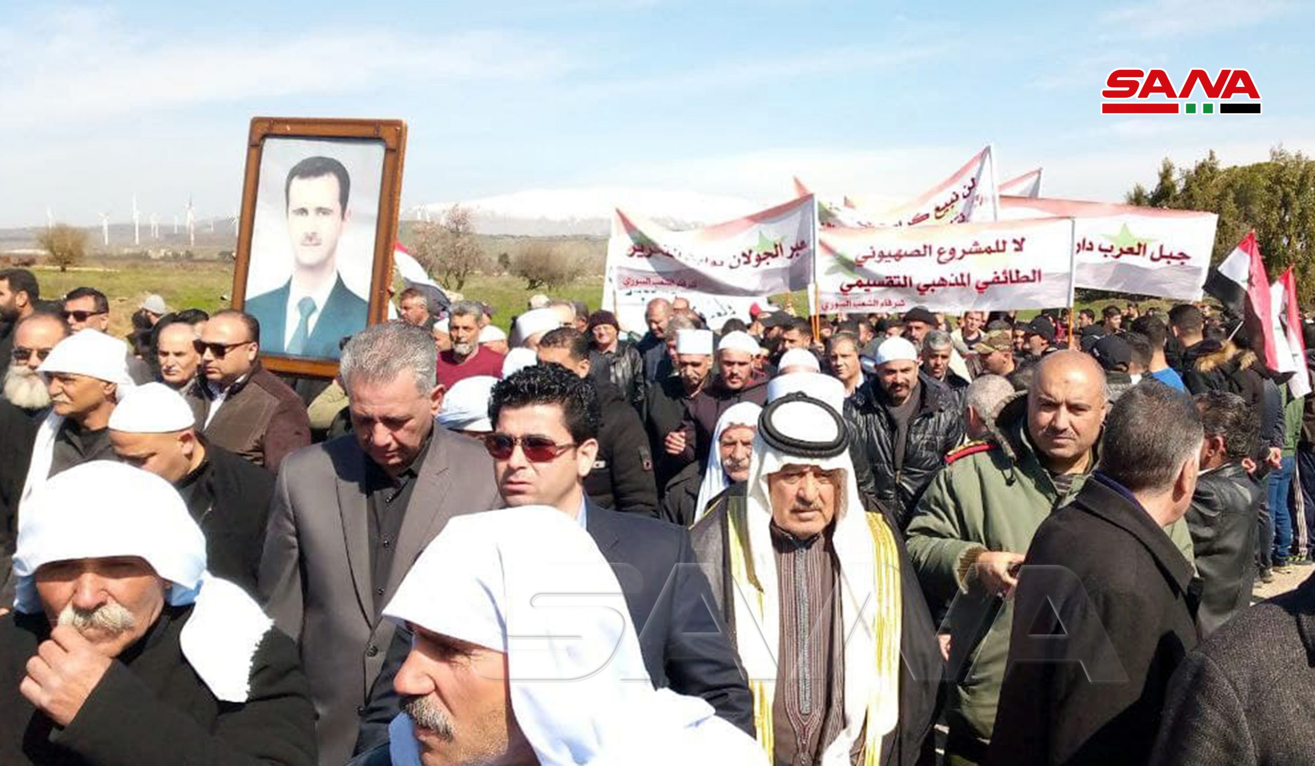 Quneitra-SANA/Les habitants de Quneitra ont observé aujourd‘hui un sit- in de protestation près du passage de la ville libérée, en rejet des mesures provocatrices des autorités de l’entité israélienne, représentées par l’ingérence dans les affaires intérieures syriennes.