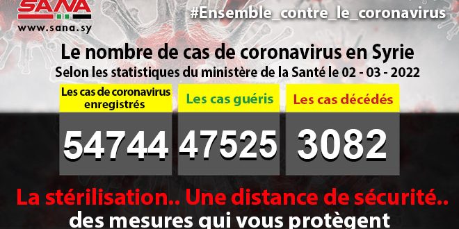 Damas-SANA / Le ministère de la Santé a indiqué que 80 nouveaux cas de coronavirus, 195 cas de guérison et 3 décès avaient été enregistrés aujourd’hui en Syrie.