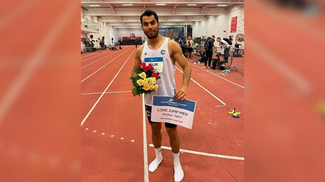 Le joueur de la sélection syrienne d’athlétisme Mohammad Amin Salamah remporte la 1ère classe dans la Rencontre du Danemark pour les professionnels aux compétitions de saut en longueur, le 3-3-2022