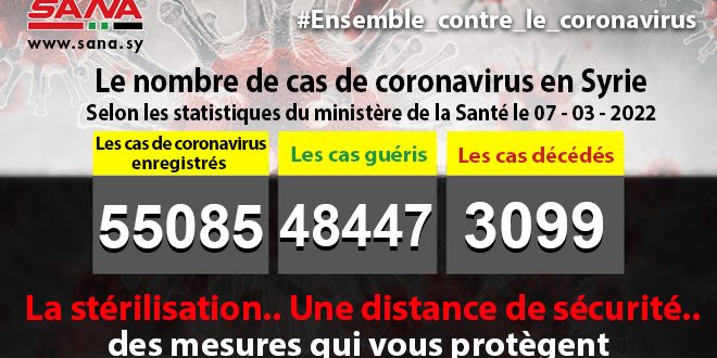Dans un communiqué, dont une copie est parvenue à SANA, le ministère a fait noter que le bilan des cas de coronavirus enregistrés jusqu’à présent en Syrie avait atteint 55085, dont 48447cas de guérison et 3099décès.