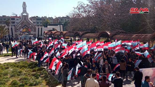 Homs-Sana/ Les étudiants et les employés à l’Université d’Al-Baath à Homs ont observé aujourd’hui un sit-in de solidarité avec la Russie et son peuple, face aux politiques américano-occidentales visant à porter atteinte à sa sécurité et sa stabilité.