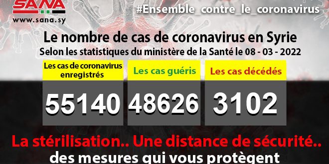 Dans un communiqué, dont une copie est parvenue à SANA, le ministère a fait noter que le bilan des cas de coronavirus enregistrés jusqu’à présent en Syrie avait atteint 55140, dont 48626 cas de guérison et 3102 décès.