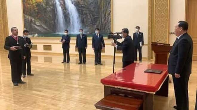 Pyongyang-SANA/ Le Présidium de l’Assemblée populaire suprême de la République populaire démocratique de Corée (RPDC) a donné une réception d’adieu en l’honneur de l’ambassadeur Tammam Souleymane, à l’occasion de la fin de ses fonctions en tant qu’ambassadeur de Syrie à Pyongyang, lequel a, à son tour, transmis au vice-président du Présidium, les salutations du président Bachar al-Assad au Président de la « RPDC », Kim Jong-un.