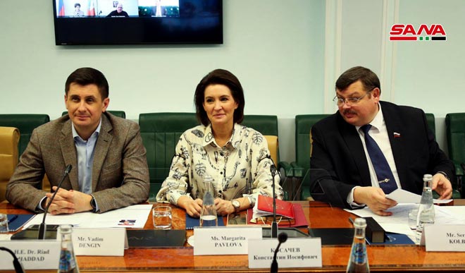 Moscou-SANA/Une rencontre élargie conjointe a eu lieu aujourd’hui via la vidéoconférence entre le Conseil de la Fédération de Russie, l’Assemblée du peuple et le groupe d’amitié parlementaire syro-russe, et ce, au siège du Conseil de la Fédération de Russie.