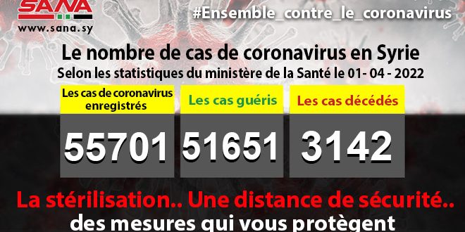 Dans un communiqué, dont une copie est parvenue à SANA, le ministère a fait noter que le bilan des cas de coronavirus enregistrés jusqu’à présent en Syrie avait atteint 55701, dont 51651 cas de guérison et 3142 décès.