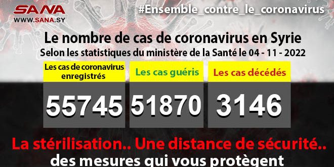 Dans un communiqué, dont une copie est parvenue à SANA, le ministère a fait noter que le bilan des cas de coronavirus enregistrés jusqu’à présent en Syrie avait atteint 55745, dont 51870 cas de guérison et 3146 décès.