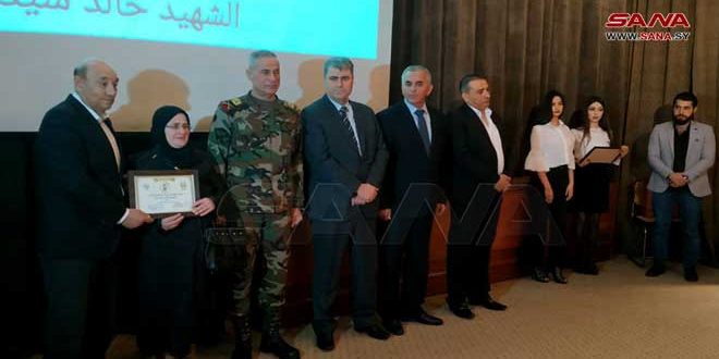 Damas-SANA/La festivité de l’Union des journalistes pour rendre hommage aux « Martyrs des médias » a débuté aujourd’hui à la bibliothèque al-Assad à Damas, en coopération avec la Fondation « un cœur un battement ».