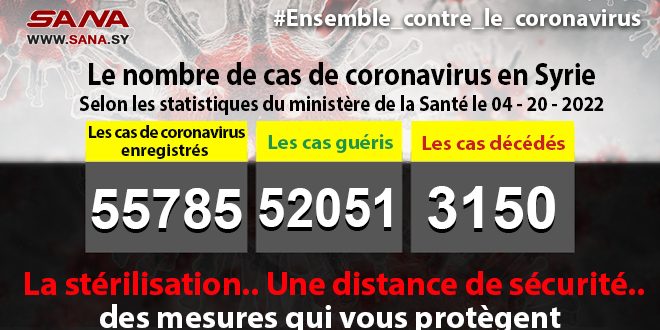 Dans un communiqué, dont une copie est parvenue à SANA, le ministère a fait noter que le bilan des cas de coronavirus enregistrés jusqu’à présent en Syrie avait atteint 55785, dont 52051 cas de guérison et 3150 décès.