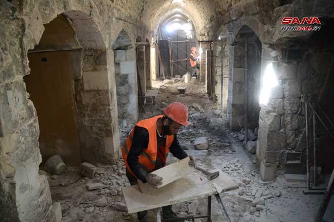 Des travaux de réhabilitation du marché d’al-Habbal dans la vieille ville d’Alep, le 21-4-2022