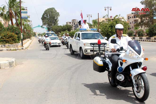 À l’occasion de la journée mondiale de la Circulation, la police de la circulation à Daraa organise une marche en vélos et en voitures de police, le 4-5-2022