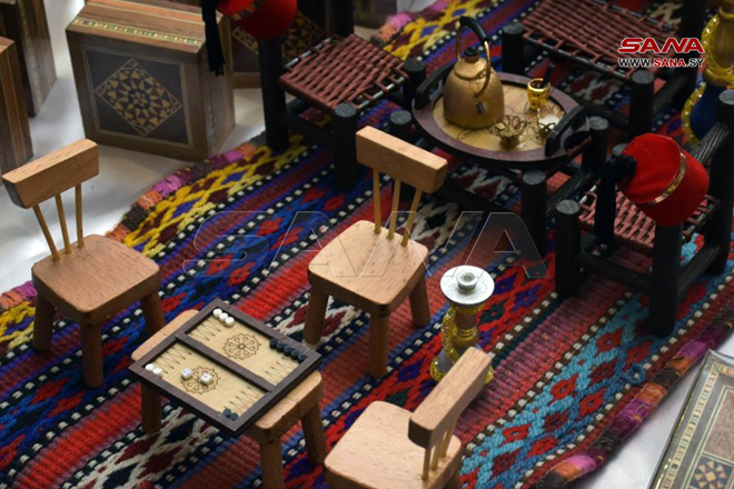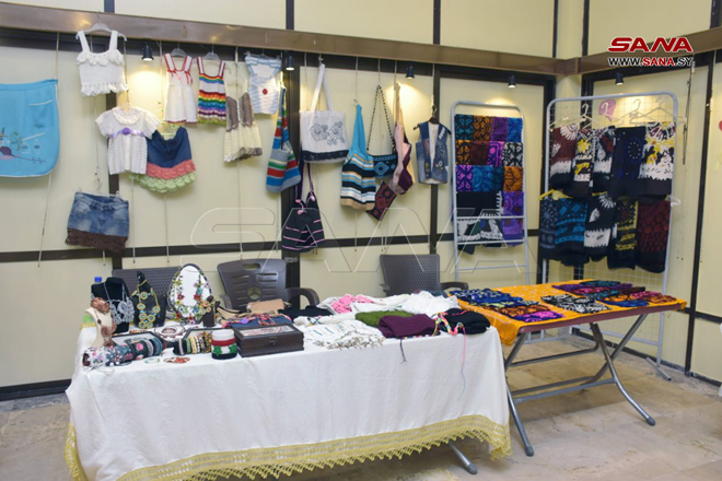L’exposition comprend des objets d’artisanat, dont des tapis, des sculptures en bois, de mosaïque, de la peinture sur verre, des bougies et de divers types de desserts célèbres à Alep.