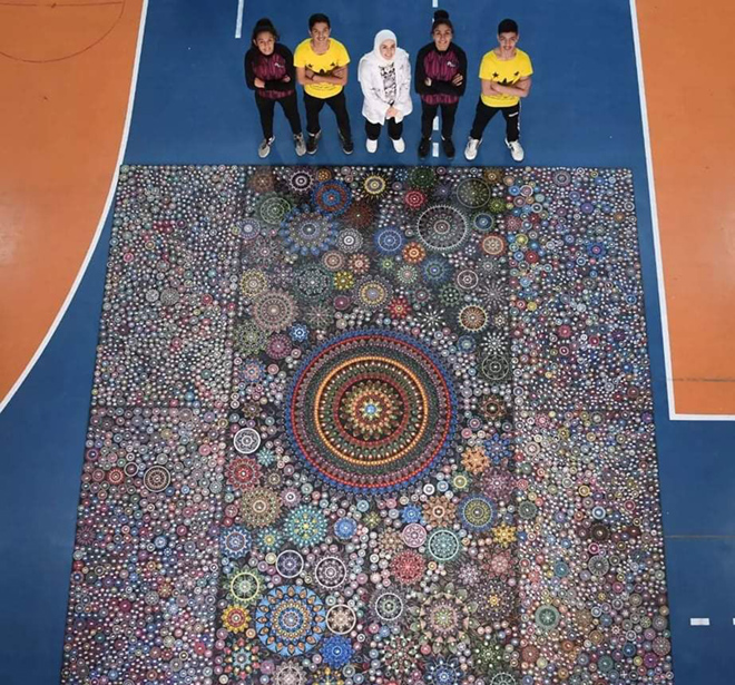 Lama a déclaré à SANA qu’après deux ans d’efforts continus et de travail avec précision et patience pour obtenir la symétrie requise dans son tableau, cette jeune syrienne a achevé le tableau et remporté le record du plus grand tableau dans le monde, qui contient 4096 cercles de mandala de différents diamètres, couleurs et dessins.