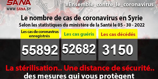 Dans un communiqué, dont une copie est parvenue à SANA, le ministère a fait noter que le bilan des cas de coronavirus enregistrés jusqu’à présent en Syrie avait atteint 55892, dont 52682 cas de guérison et 3150 décès.