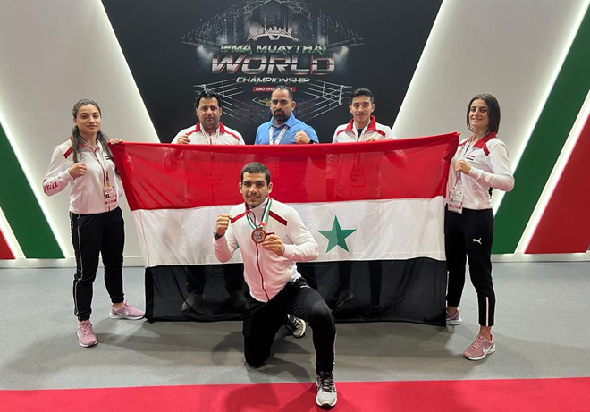L’athlète de la sélection syrienne de muay-thaï, Alaa Abou Jaiche, remporte la médaille de bronze au Championnat du monde, organisé actuellement à Abou Dabî, le 4-6-2022