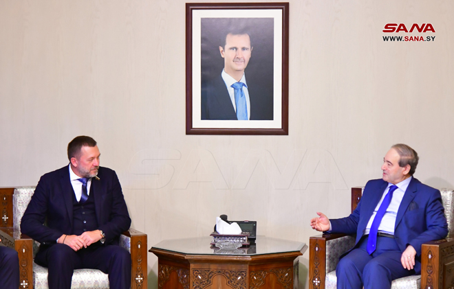 Damas –SANA/Fayçal Miqdad, ministre des Affaires étrangères et des Expatriés, a tenu aujourd’hui une séance d’entretiens avec le président de la partie russe à la commission parlementaire d’amitié russo-syrienne , Dimitri Sabline, la ministre des Affaires étrangères de Donetsk , Natalia Nikonorova, et le ministre de la Culture, Mikhaïl Saltykov.