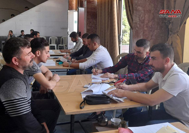 Des dizaines de personnes recherchées rejoignent le processus de la régularisation dans la salle sportive d’al-Assad à Alep, le 12-6-2022