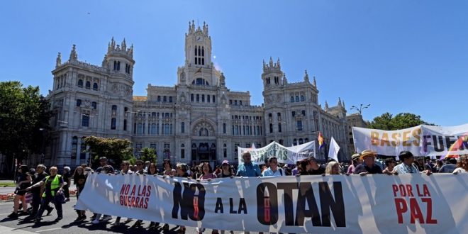 Madrid-SANA / Plusieurs milliers de personnes ont manifesté dans le centre de Madrid pour exiger la dissolution de l’OTAN et réclamer la paix, à deux jours de l’ouverture du prochain sommet de l’Alliance atlantique dans la capitale espagnole.