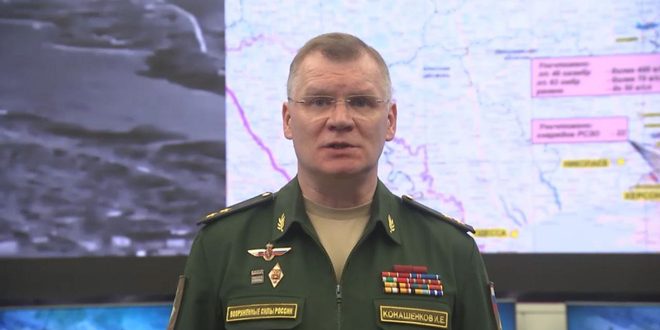 Le porte-parole du ministère, le général Igor Konachenkov, a dit aujourd’hui ‘’les frappes de l’armée de l’air russe et des unités d’artillerie avaient détruit le site temporaire de déploiement de la 46e brigade appartenant aux forces armées ukrainiennes et éliminé plus de 400 éléments des nationalistes extrémistes dans la banlieue de Kherson.