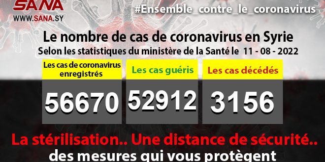 Dans un communiqué, dont une copie est parvenue à SANA, le ministère a fait noter que le bilan des cas de coronavirus enregistrés jusqu’à présent en Syrie avait atteint 56670, dont 52912 cas de guérison et 3156 décès.