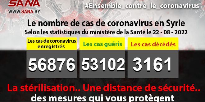 Damas-SANA / Le ministère de la Santé a fait allusion à la détection de 15 nouveaux cas de coronavirus en Syrie, au rétablissement de 22 cas et au décès d’un cas.