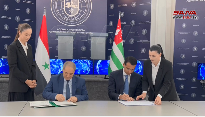 Miqdad et Ardzinba signent un mémorandum d’entente et de coopération entre la Syrie et l’Abkhazie dans le domaine des consultations politiques, le 25-08-2022