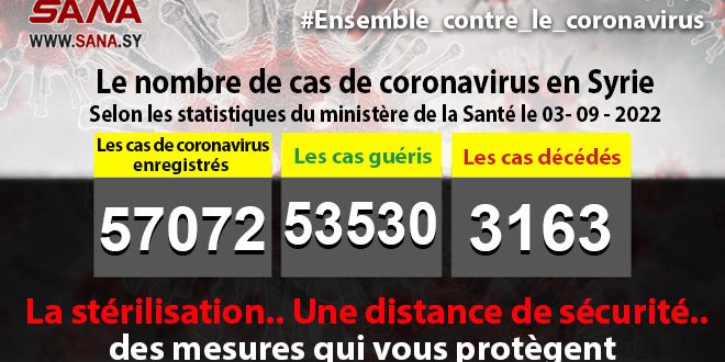 Dans un communiqué, dont une copie est parvenue à SANA, le ministère a fait noter que le bilan des cas de coronavirus enregistrés jusqu’à présent en Syrie avait atteint 57072, dont 53530 cas de guérison et 3163 décès.