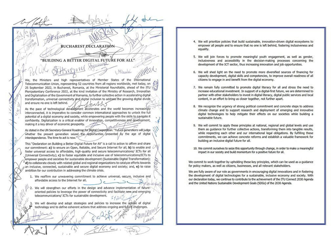 La Déclaration de Bucarest a attiré l’attention sur le renforcement des politiques destinées à l’avenir afin de profiter du pouvoir des communications, de faciliter les technologies numériques et d’adopter des stratégies et des politiques propices à l’augmentation de l’adoption des technologies numériques.