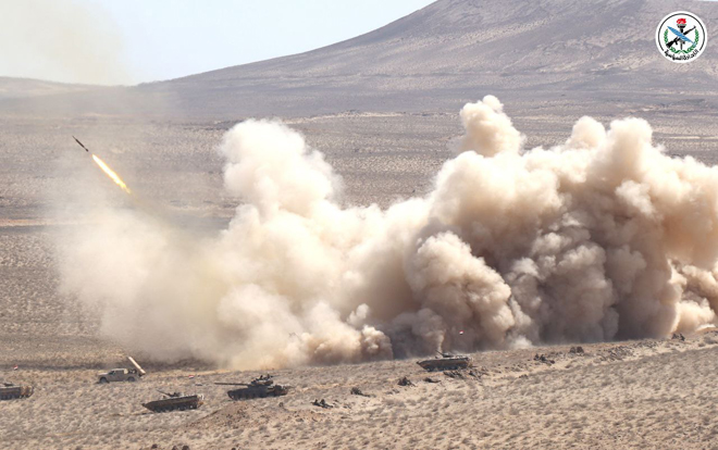 L’exercice a débuté par le lancement d’obus d’artillerie, de missiles et d’obus de mortier sur l’ennemi hostile avant de porter des frappes aux missiles sol-sol et des frappes aériennes. Ensuite, des unités des sapeurs ont avancé en ouvrant des accès via les champs de mines, alors que des unités de chars et d’infanterie ont progressé sous une couverture de feu intensive par les différents systèmes d’armes et ont pu détruire les premières lignes des forces hostiles. De même, un débarquement aérien derrière les lignes de l’ennemi a eu lieu sous une couverture de feu intensive, ainsi que l’encerclement des points de renforts, ce qui a poussé l’ennemi à faire adhérer les forces se trouvant à la 2e ligne et ses réserves au fond en menant une contre-attaque éventuelle qui avait été repoussée par nos forces en y lançant des missiles et y portant des frappes aériennes qui l’a obligé à se retirer.