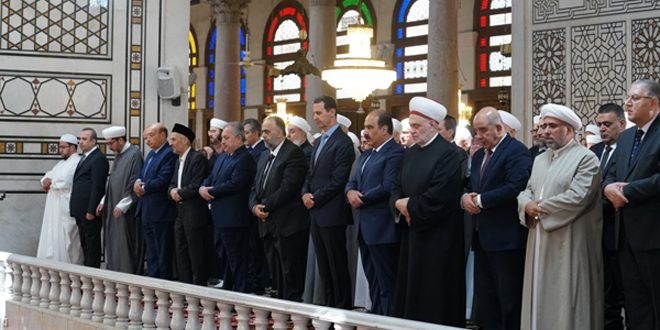 Damas-SANA/ Le président Bachar al-Assad a pris part à une cérémonie religieuse, organisée cet après-midi par le ministère des Waqfs, à l’occasion du Mouloud (fête de naissance du prophète Mohammad) dans la Grande Mosquée des Omeyyades à Damas.