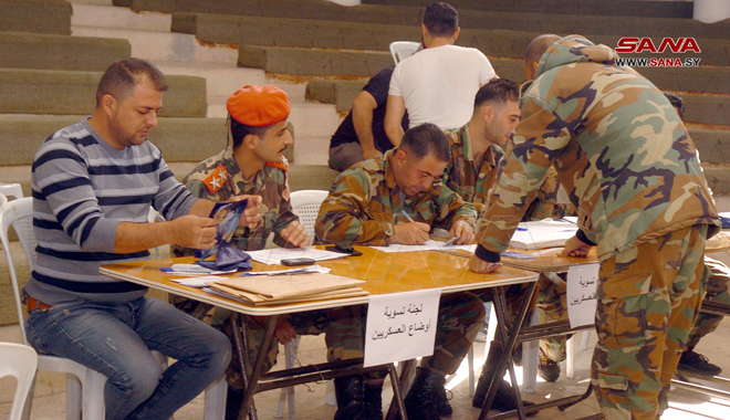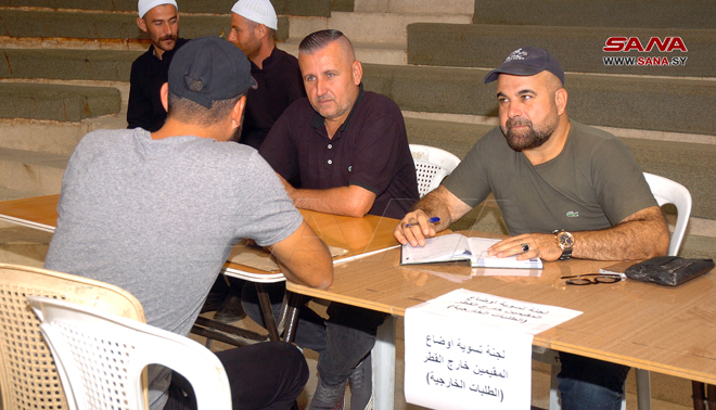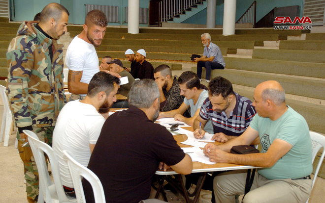 Soueidaa- SANA/ Le comité concerné continue à régulariser la situation des civils recherchés, des déserteurs et des personnes qui ont échappé aux deux services obligatoires et de réserve dans le centre de la salle du 7 avril de la ville de Soueidaa, au milieu de procédures simplifiées.