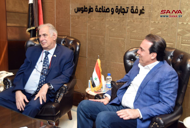 Tartous-Sana/ La rencontre des membres de la Chambre de commerce et d’industrie de Tartous avec l’ambassadeur de la République d’Afrique du Sud en Syrie, Barry Gilder, a porté sur les moyens de renforcer la coopération commerciale entre les deux pays dans divers domaines économiques.