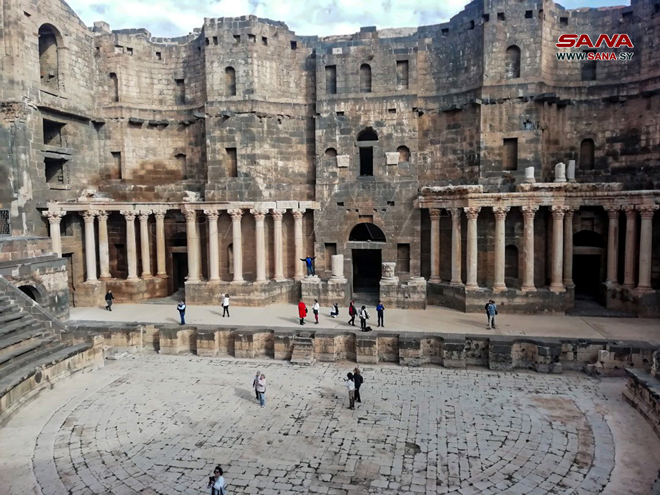 Deux groupes de touristes du Liban et de Slovénie visitent les antiquités à Bosra Cham, le 13-11-2022