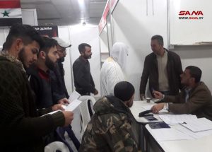 Homs-SANA/ Les services compétents poursuivent le processus de la régularisation de la situation des personnes recherchées, dont des civils et des militaires, au centre de la cité des Foires dans le quartier d’al-Wa’er dans la ville de Homs, et ce, conformément à l’accord avancé par l’Etat en prélude à leur retour à la vie normale.